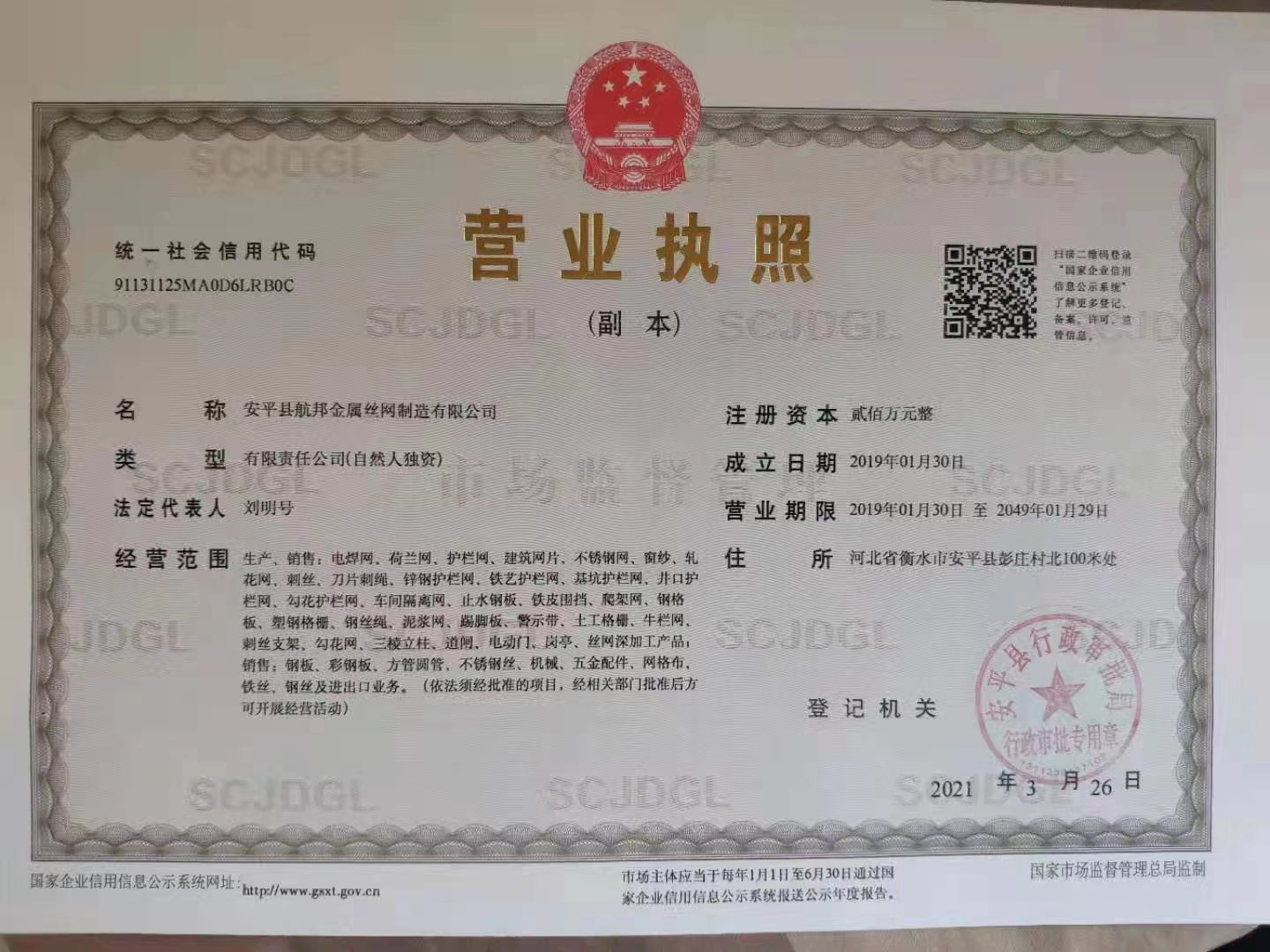 航邦金属丝网制造有限公司总部建立于丝网之乡衡水市安平县,集各种丝网的研发、生产、销售为一体的大型企业,我们主要生产各铁路隔离栅、边境Y型护栏网、车间隔离网、体育场防护网、临时防护网、刺丝防护网、镀锌铁丝、电焊网片、钢筋网片、三棱立柱复合立柱等系列产品,广泛用于矿业、航天、石油、化工、食品、医药、橡胶、塑料、机械等行业。本公司在全国设有25个销售机构,大大方便了发货速度,和客户洽谈等事宜。我公司一直坚持“以质量求生存、以信誉求发展、以市场为导向、向管理要效益”的企业理念,靠科学的管理手段、先进的设备和严格的工艺流程、强烈的事业心,赢得了广大用户的信任和好评。产品销售网络遍及河南、山东、江西、浙江、内蒙等全国30多个省市,并且出口到东南亚、欧洲、美洲等 100多个国家和地区。航邦金属丝网制造有限公司旗下泽明护栏网厂--金灏电焊网荷兰网厂--灏祥拔丝织网厂在业界很受称赞。“用户至上、信誉”,我厂愿以优良的产品,优质的服务,与国内外新老客户一起共创辉煌欢迎四海朋友的光临与合作,同时希望得到广大新老客户的意见与建议。